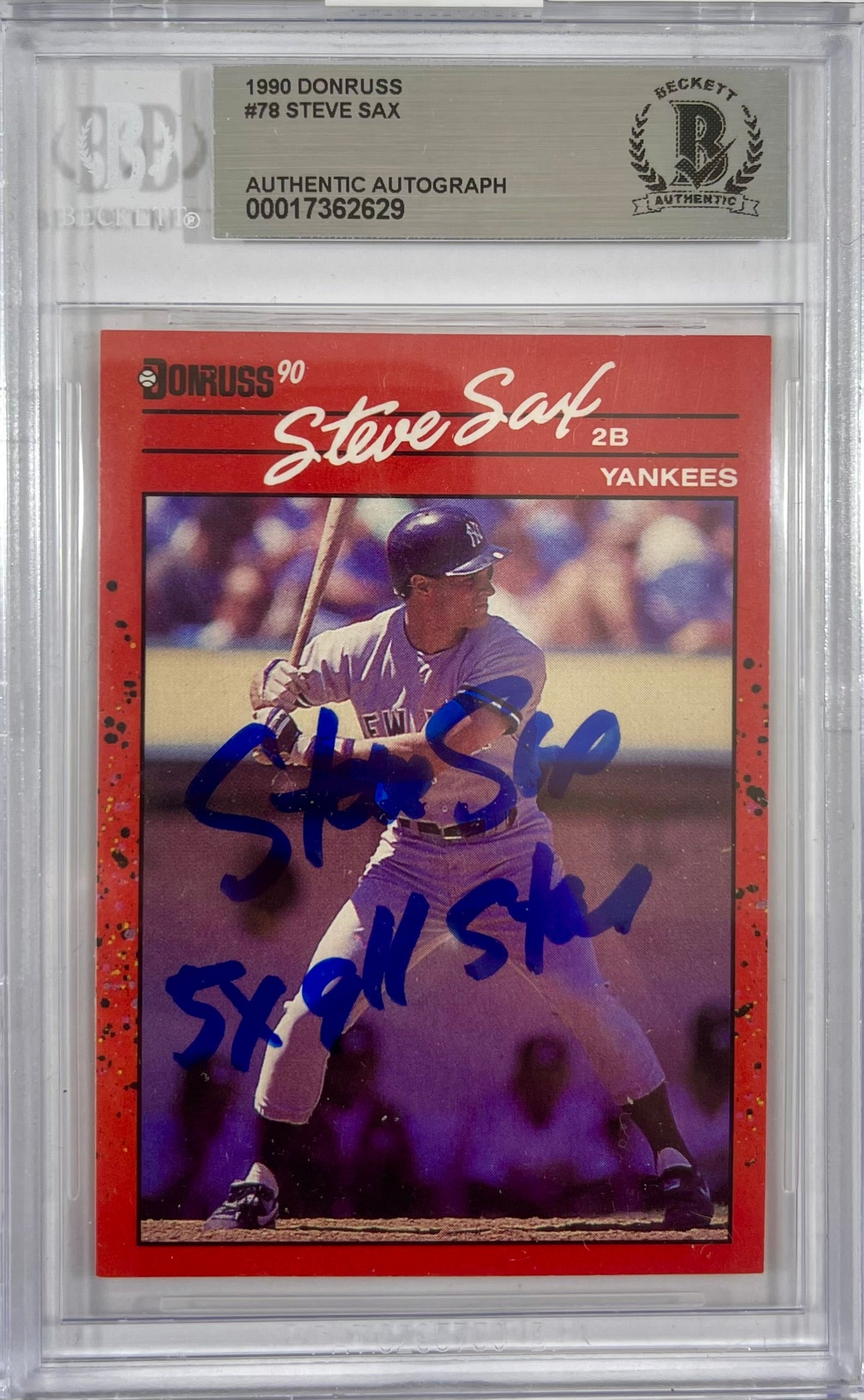 This is an autographed 1989 Leaf #78 card that has been hand signed by Steve Sax and inscribed. Perfect for any collection. This card comes Beckett encapsulated verifying its authenticity. 100% authentic. Another great product brought to you by JAG Sports Marketing.