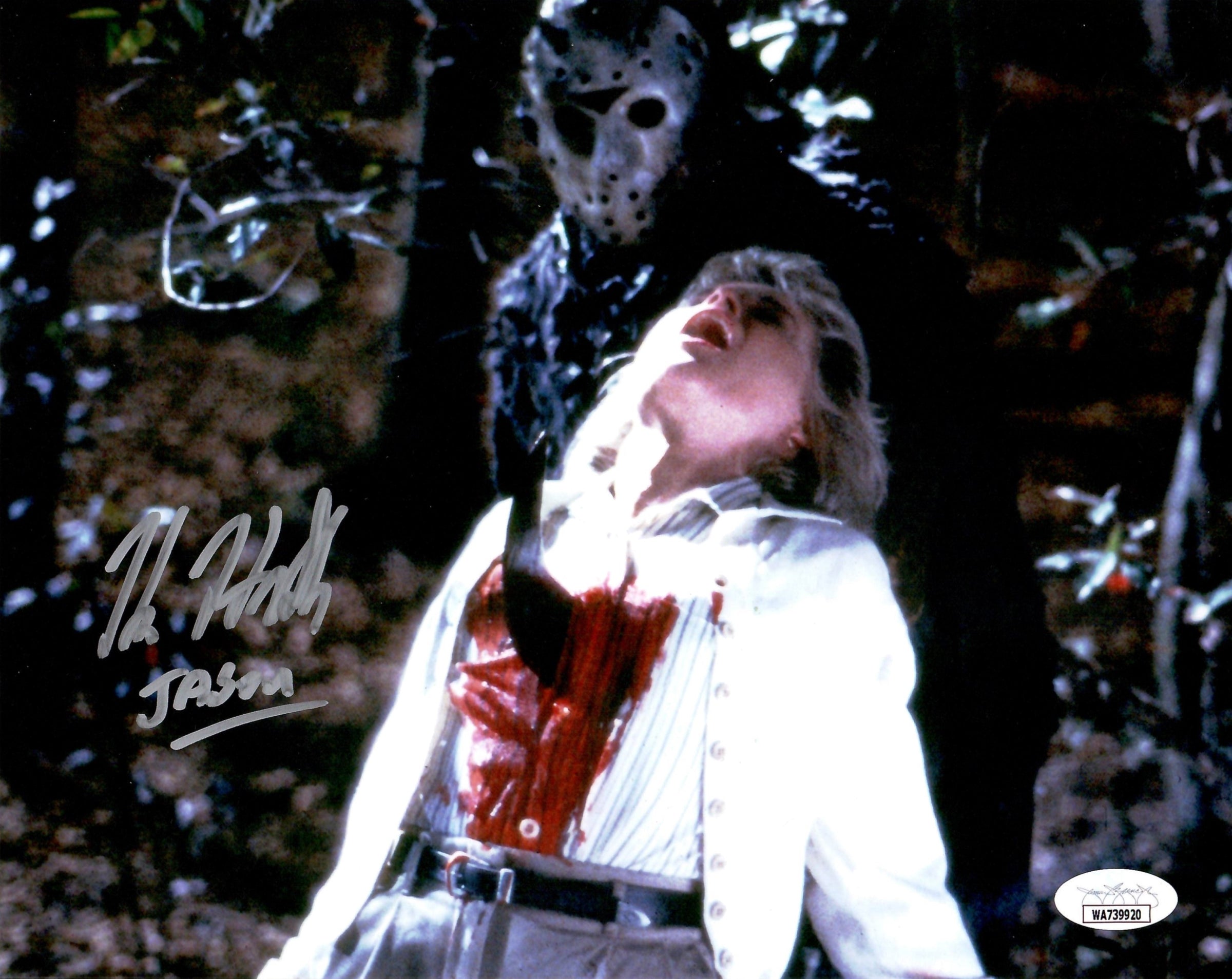 This is an autographed 8x10 photo that has been hand signed by Kane Hodder and inscribed "Jason". The photo comes with a certificate of authenticity from JSA. Perfect for framing. Another great product brought to you by JAG Sports Marketing.
