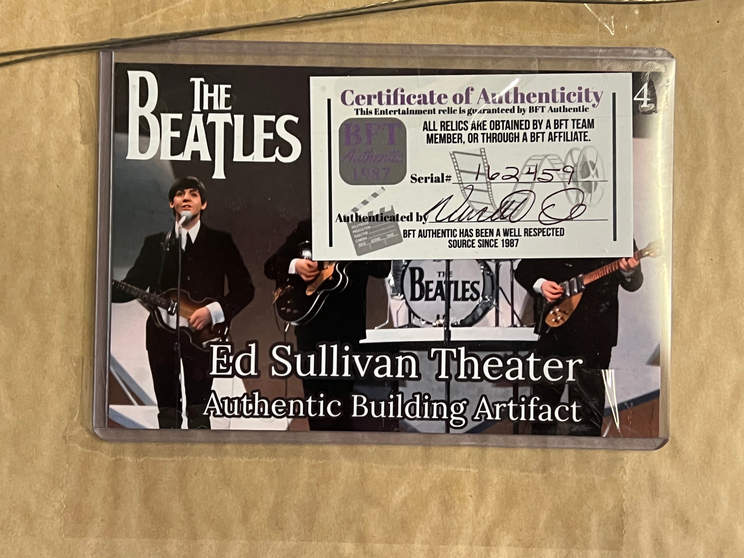 This is an autographed relic piece taken directly from the Ed Sullivan Theatre where the Beatles performed. Perfect for any collection. This comes with a certificate of authenticity from BFT. 100% authentic. Another great product brought to you by JAG Sports Marketing.