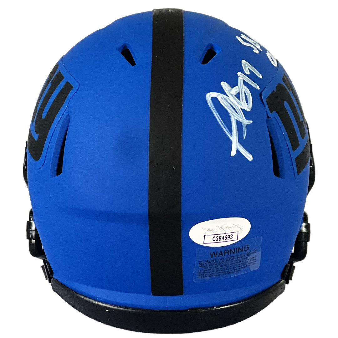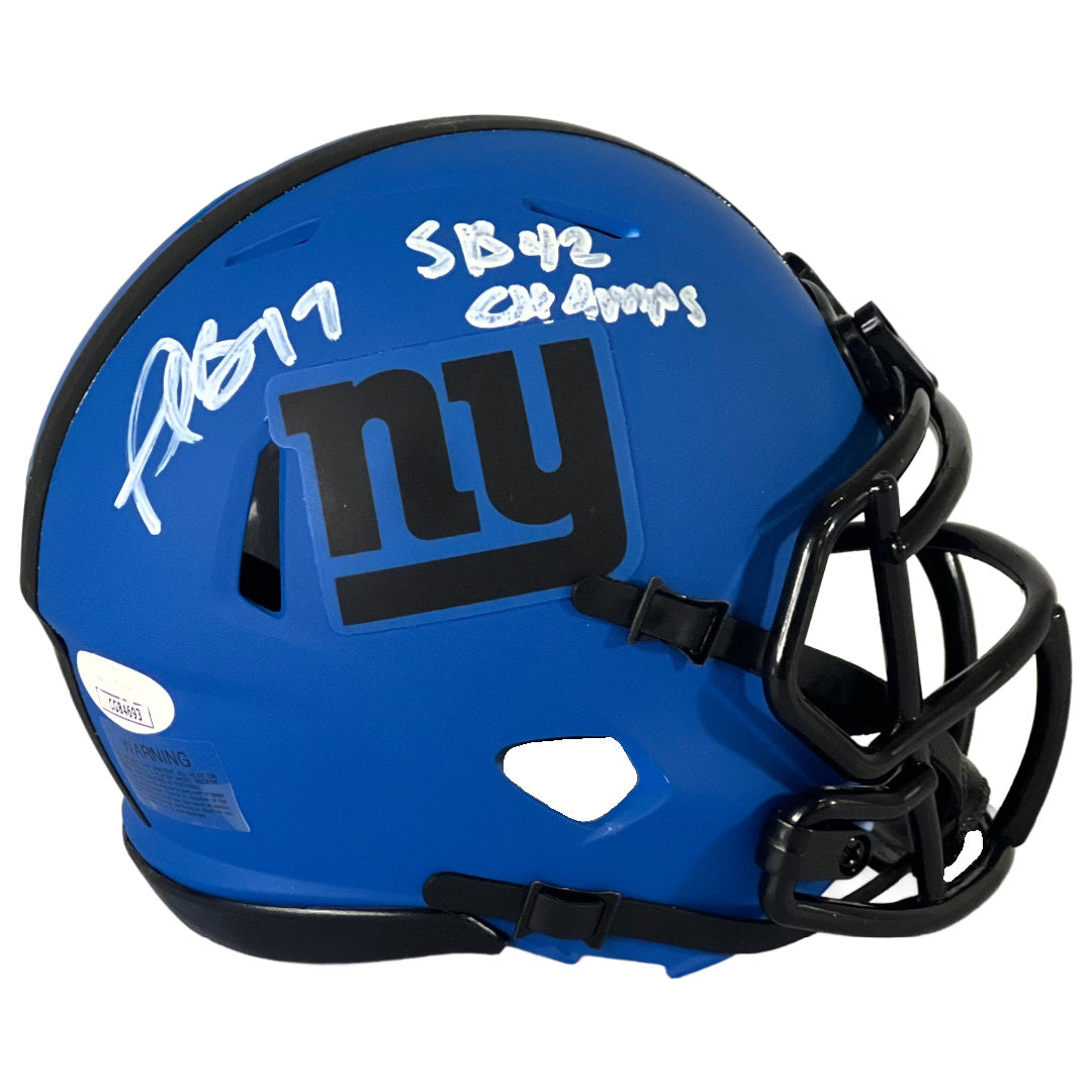 This is an autographed mini helmet that has been hand signed by Plaxico Burress and inscribed "SB 42 Champs". A perfect helmet for any collection. The helmet comes with a certificate of authenticity from JSA. Perfect for framing. 100% authentic. Another great product brought to you by JAG Sports Marketing.