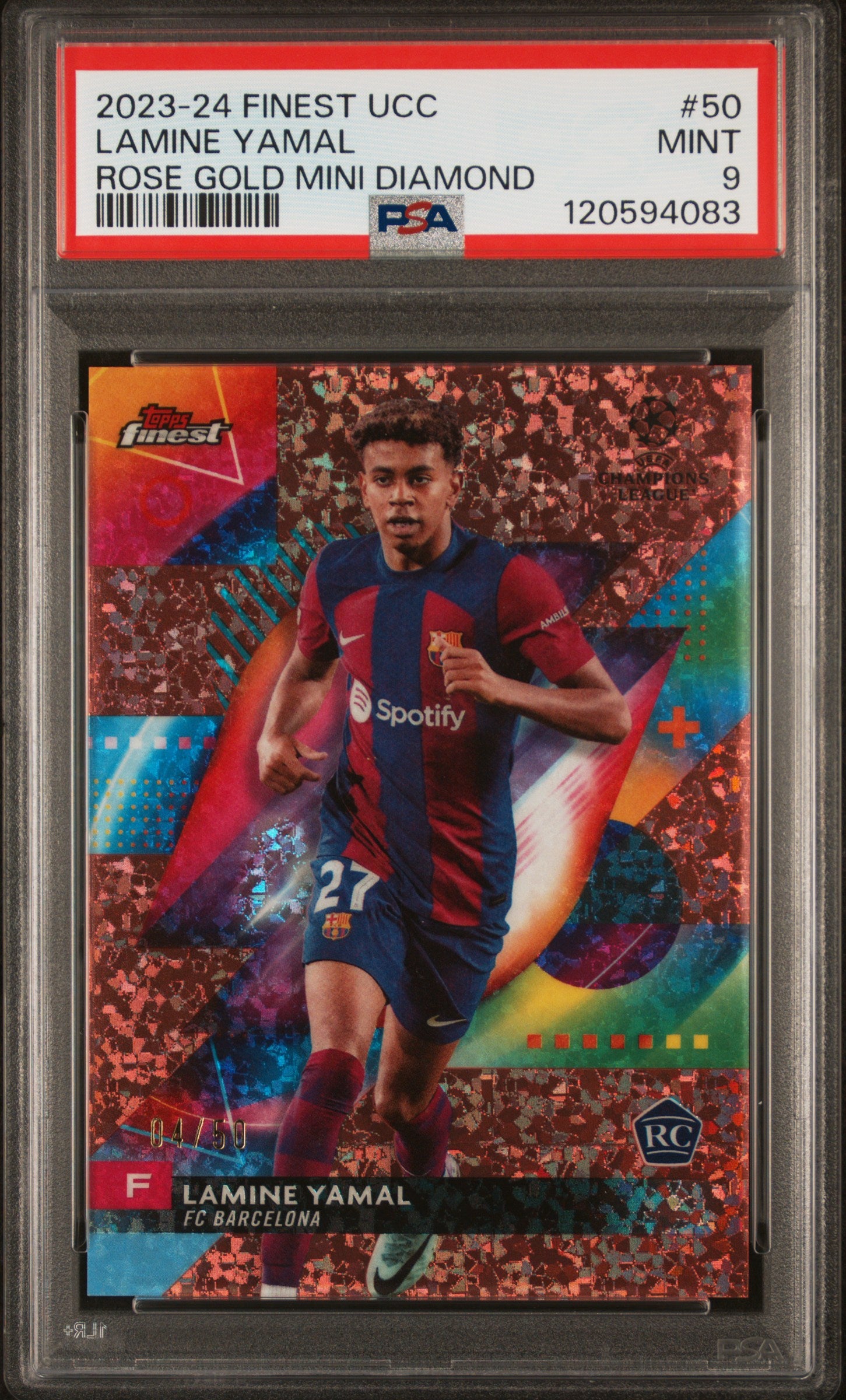 Home / Soccer / Lamine Yamal RC 2023-24 Topps Finest Rose Gold Mini Diamond 04/50 PSA