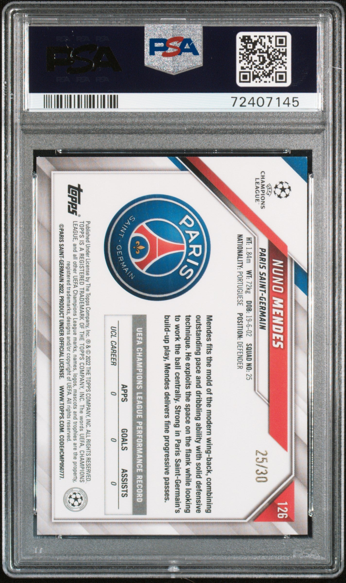Nuno Mendes RC 2021 Topps UEFA Champions League #126 Blue Foil PSG PSA 9 /30