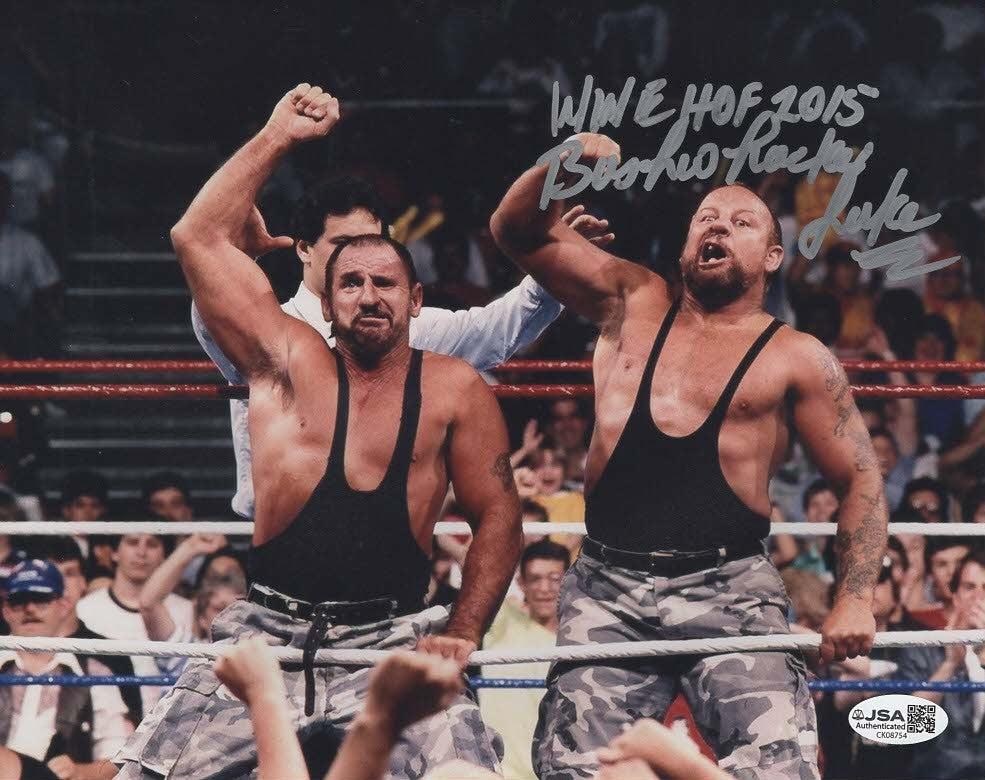 This is an autographed 8x10 photo that has been hand signed by Bushwhacker Luke and inscribed. Perfect for any collection. This comes with a sticker of authenticity from JSA. 100% authentic. Another great product brought to you by JAG Sports Marketing.