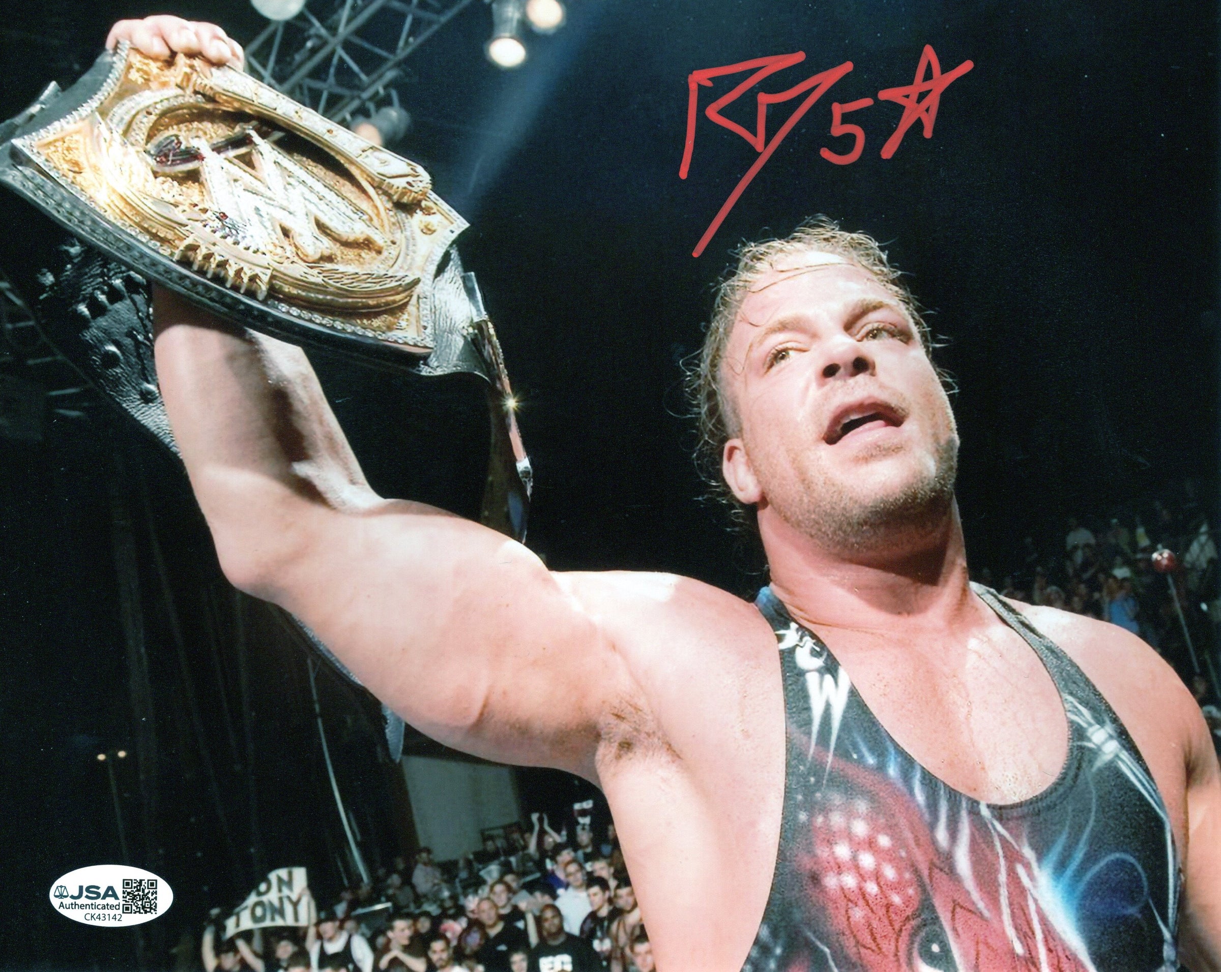 This is an autographed 8x10 photo that has been hand signed by Rob Van Dam. Perfect for any collection. This comes with a sticker of authenticity from JSA. 100% authentic. Another great product brought to you by JAG Sports Marketing.