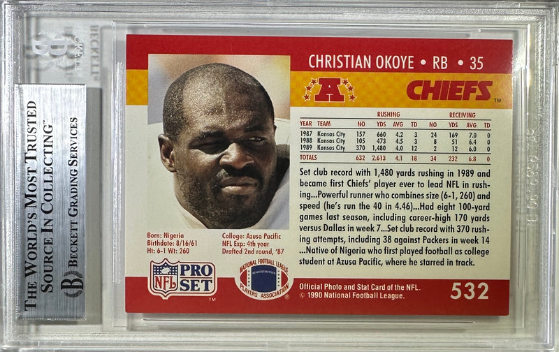 Christian Okoye auto NFL Pro Set 1990 #532 Kansas City Chiefs BAS Encap card