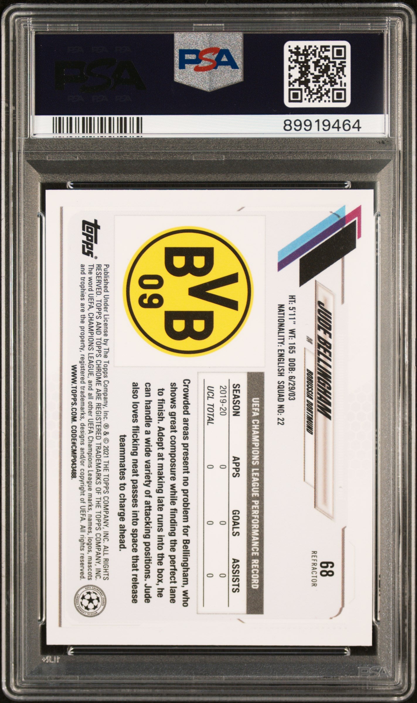 Jude Bellingham RC 2020 Topps Chrome UCL Champions League Refractor #68 PSA 9
